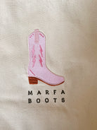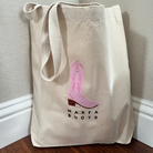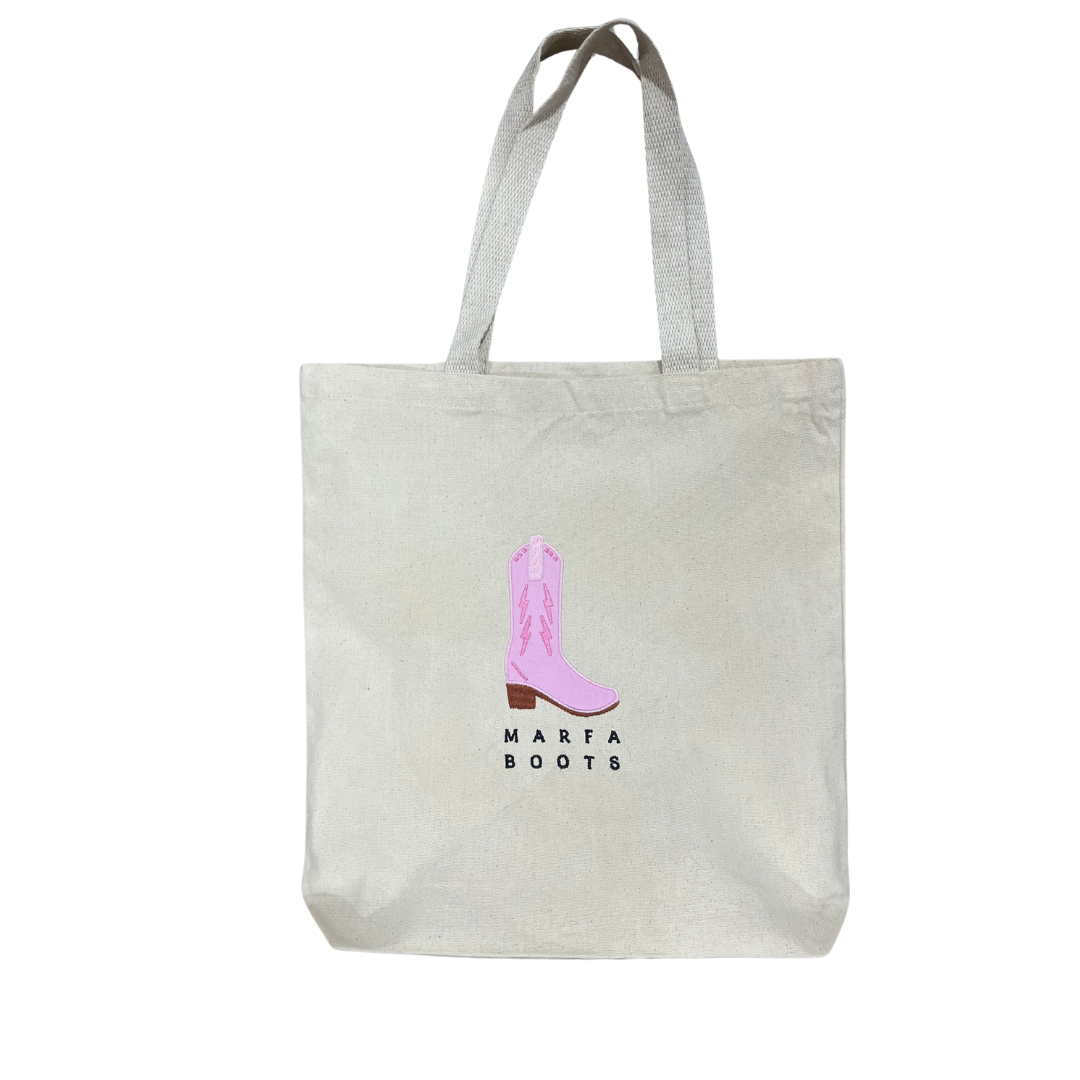 Discover the perfect all-in-one accessory for the girl on the go with Marfa Boots tote bag! Embroidered locally in DFW by a fellow small business, our durable and stylish canvas bag is ideal for any day, from farmer's market runs to errands.