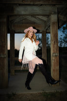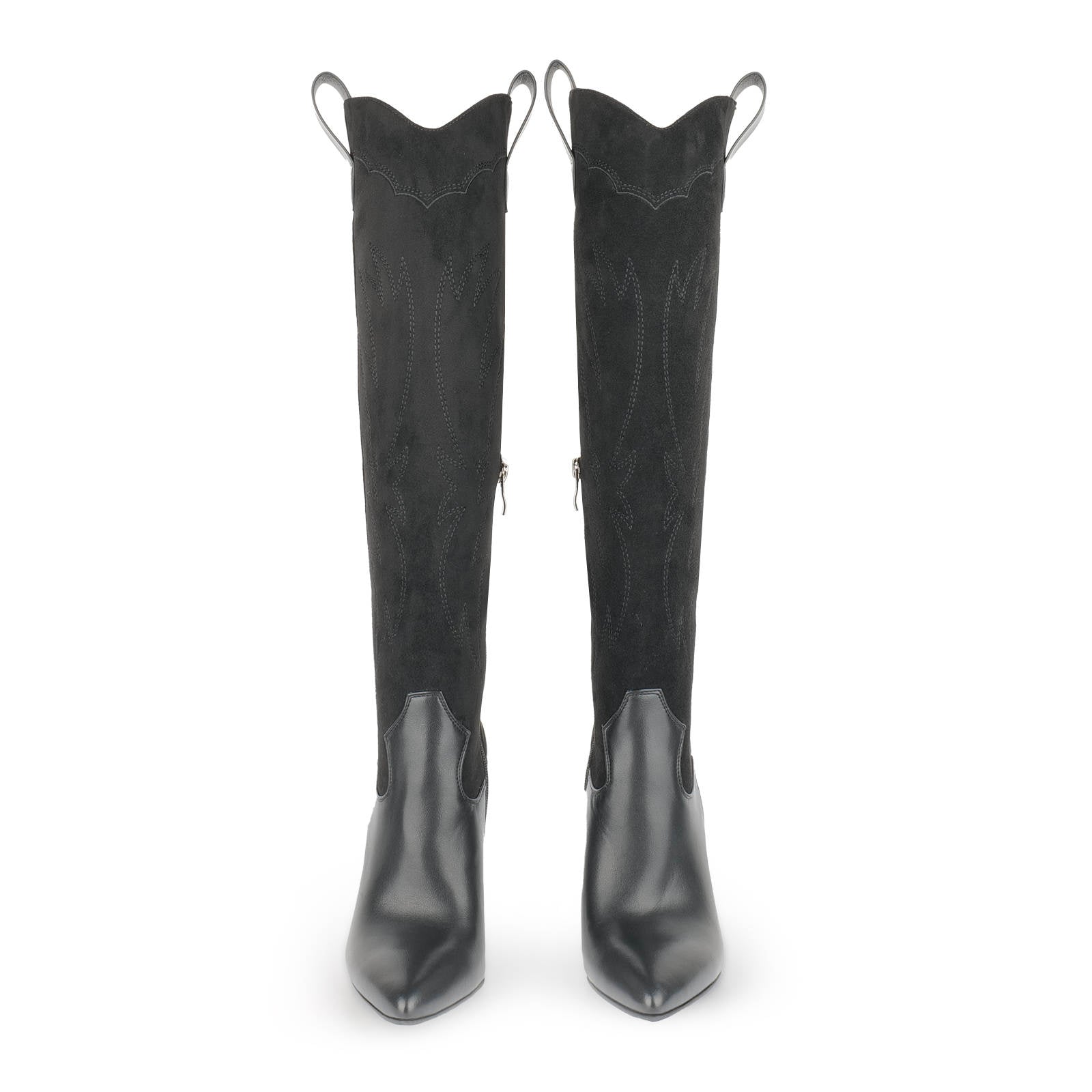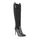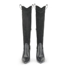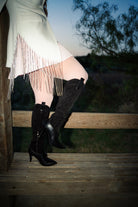 Introducing The Shania - our stunning, tall black suede cowboy boots with a high heel and a smooth leather look around the foot. The sleek stiletto heel adds height and sophistication while still staying comfortable all night long. In addition, the intricate western stitch pattern adds a unique and eye-catching detail sure to get you loads of compliments on a night out.