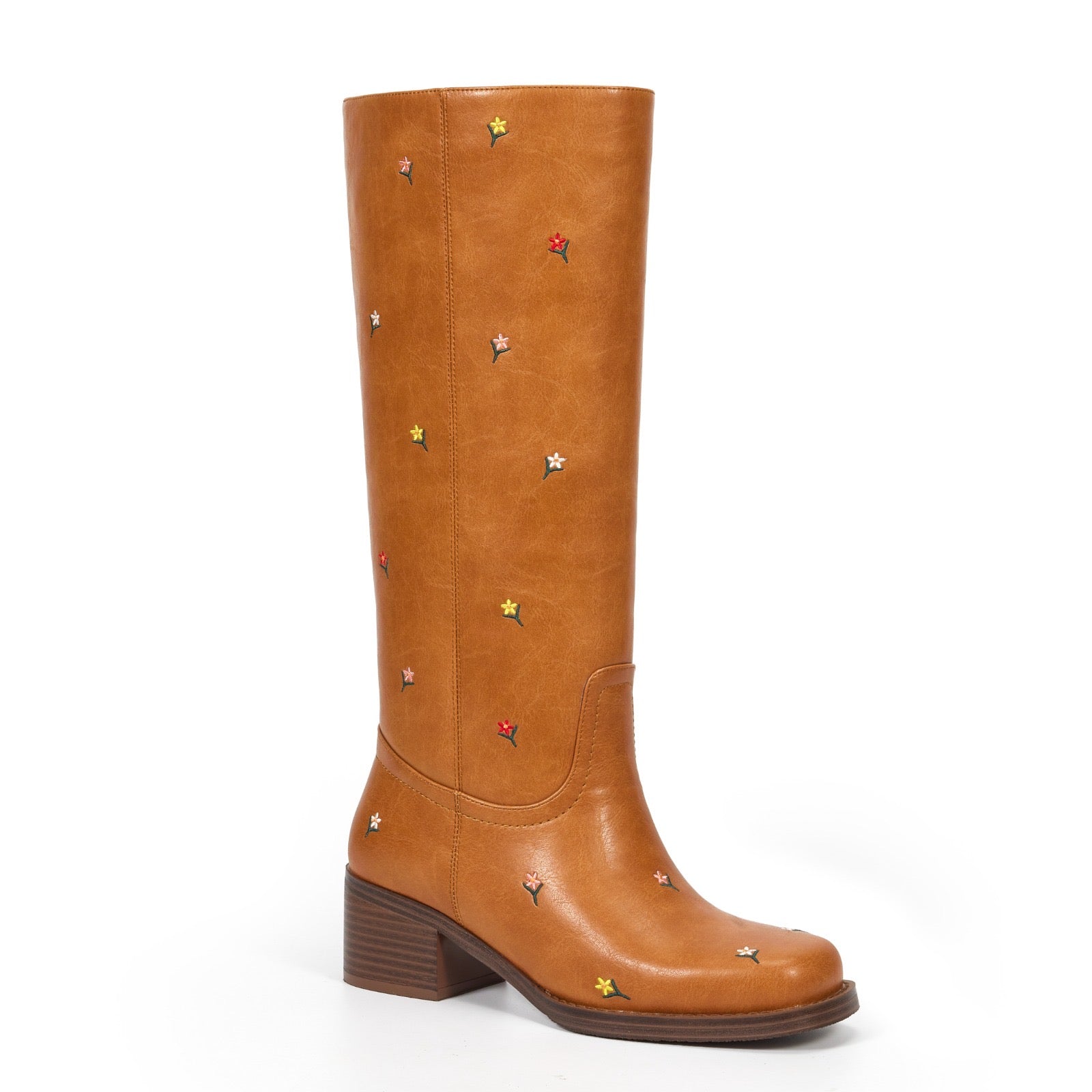 Introducing The Carter- a cognac pull-on boot with a square toe silhouette and delicate embroidered flowers. A whimsical touch that transforms these boots into wearable art. The perfect boot to complete your outfit year round.